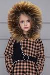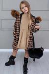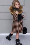 Kız Çocuk Kapüşonlu Peluş Detaylı Kare Desenli Kahverengi Kaban