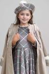 Kız Çocuk Kazayağı Desen Elbise Kolları Peluş ve Omuzları İnci İşleme Kemerli Fildişi Kaşe Kaban