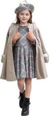 Riccotarz Kız Çocuk Kazayağı Desen Elbise Kolları Peluş ve Omuzları İnci İşleme Kemerli Fildişi Kaşe Kaban