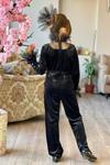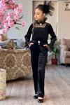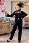 Kız Çocuk Kolları İnci İşlemeli Yakası Tül Detaylı Kare Yaka Kadife Siyah Tulum