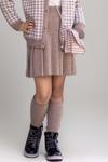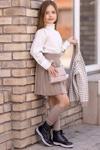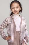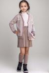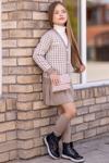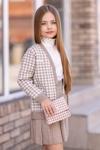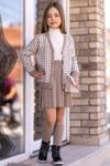 Kız Çocuk Kolları ve Yakası İnci Detaylı Bluz Kazayağı Desenli Triko Ceket Gri Etekli Takım