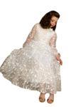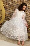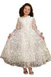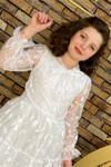 Kız Çocuk Kolları ve Yakası Şeffaf Tüllü ve Yaprak Detaylı Beyaz Elbise