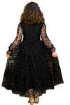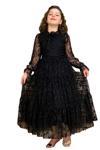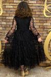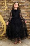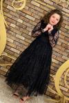 Kız Çocuk Kolları ve Yakası Şeffaf Tüllü ve Yaprak Detaylı Siyah Elbise