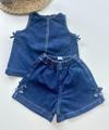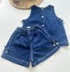 Modern tasarımıyla dikkat çeken bu lacivert kız çocuk denim takım, hem şıklığı hem rahatlığı bir arada sunar. Kolsuz üst ve lastikli şorttan oluşan takım, minik fiyonk detayları ve kontrast dikişleriyle zarif bir görünüm sağlar. Yaz aylarında konforlu kullanım için idealdir.