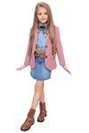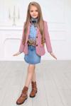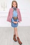 Kız Çocuk Leopar Desenli Fiyonk Detaylı Kot Gömlek Pudra Blazer Ceket Etekli Takım
