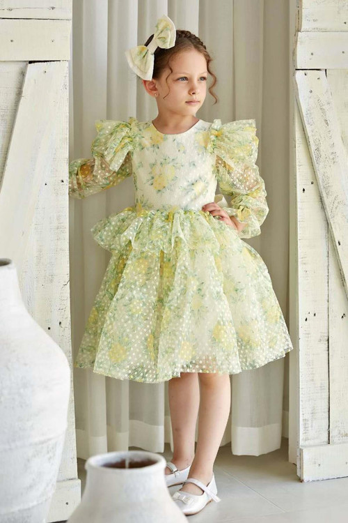 Riccotarz Kız Çocuk Omuzları ve Beli Fırfırlı Puantiye Detaylı Şeffaf Tül Çiçek Desenli Kabarık Sarı Elbise