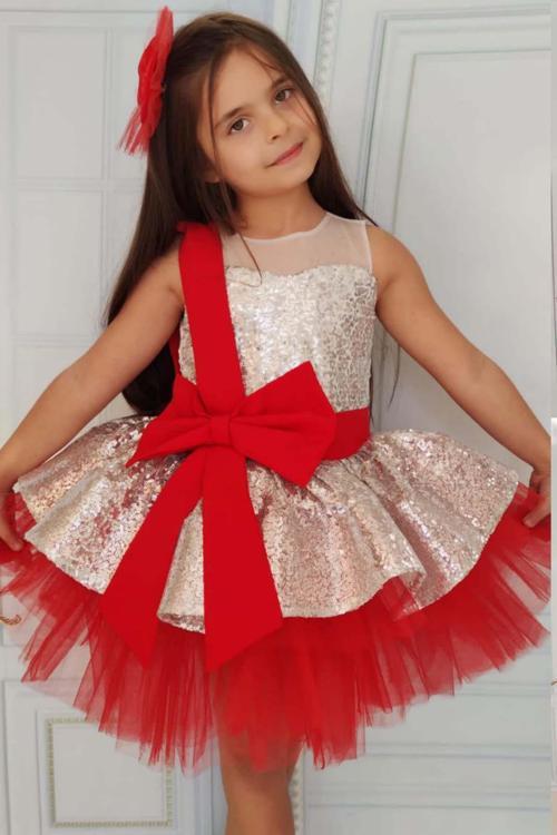 Kız Çocuk Önü ve Arkası Fiyonk Detaylı Üstü Pulpayet İşlemeli Etek Ucu Tüllü Gümüş Abiye