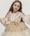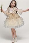 Kız Çocuk Parlak Pulpayet İşlemeli Yakası Taş Şerit Detaylı Eteği Kat Kat Tüllü Bej Abiye