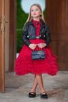 Riccotarz Kız Çocuk Sıfır Kol Beli Taş Şerit Detaylı Eteği Kat Kat Tüllü Parlak Deri Ceketli Kırmızı Elbise