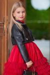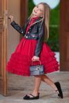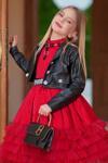 Kız Çocuk Sıfır Kol Beli Taş Şerit Detaylı Eteği Kat Kat Tüllü Parlak Deri Ceketli Kırmızı Elbise