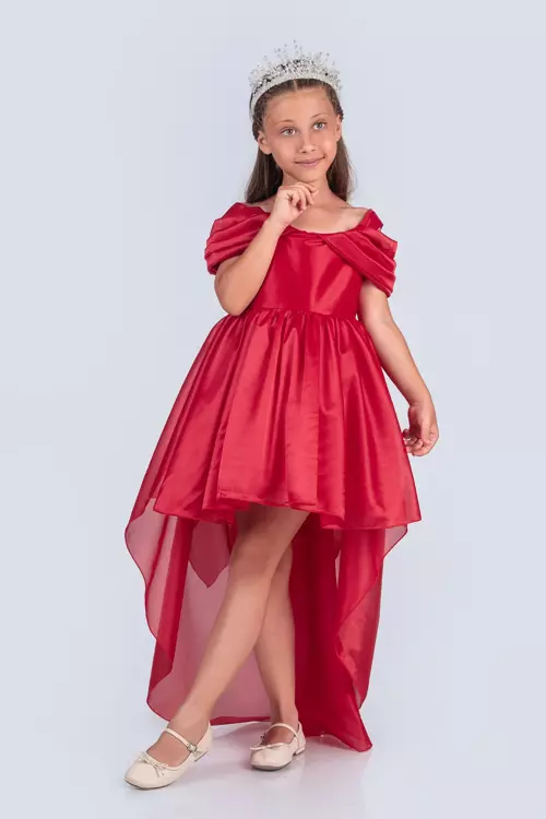 Kız çocuklar için tasarlanmış bu özel prenses abiye elbise, doğum günü, düğün, mezuniyet gibi özel günlerde göz kamaştırmak için ideal bir tercihtir. Canlı kırmızı rengiyle dikkat çeken elbise, düşük omuz detayı ve asimetrik etek kesimiyle modern bir şıklık sunar. Hafif ve dökümlü kumaşı sayesinde çocuğunuz rahatça hareket edebilir. Ürünle birlikte gelen zarif taç, görünümü tamamlayan şık bir aksesuar olarak sunulmaktadır.
