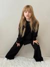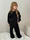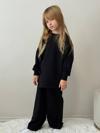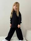 Kız çocuklar için özel olarak tasarlanan bu şık eşofman takımı, zarif detaylarıyla öne çıkıyor. Siyah renkli oversize sweatshirt modeli, üzerinde yer alan siyah fiyonk süslemeleriyle modern ve sevimli bir görünüm kazandırır. Rahat kalıplı eşofman altı ile kombinlenen takım, hem günlük kullanımda hem de özel günlerde tercih edilebilecek şıklık ve konforu bir arada sunar.