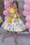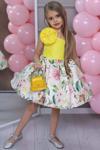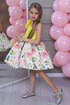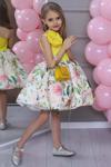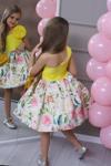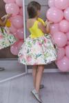 Kız Çocuk Tek Omuz Gül Broşlu Eteği Kabarık Çiçek Desenli Sarı Abiye