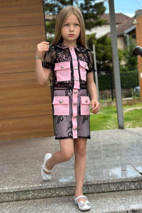 Kız Çocuk Transparan Dantel İşlemeli İçi Astarlı Cep Detaylı Pempe Etekli Takım