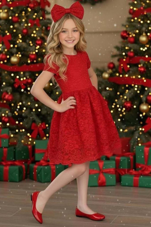 Kız Çocuk Üzeri Dantel İşlemeli İçi Astarlı Simli Kırmızı Abiye