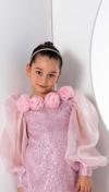 Kız Çocuk Yakası Boydan Gül Broş Detaylı Bilekleri ve Üzeri Pullu Karpuz Kollu Pembe Elbise