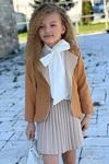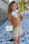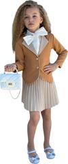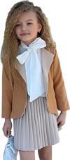 Kız Çocuk Yakası Kurdele Bağlama Detaylı Şifon Gömlek Blazer Ceket Pliseli Bej Etekli Takım