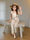 Doğal şıklığıyla öne çıkan bu keten görünümlü takım, yaz aylarının vazgeçilmez parçalarından biri olmaya aday. Hafif ve rahat kumaşı sayesinde çocukların gün boyu serin ve konforlu hissetmesini sağlarken, zarif tasarımıyla özel günlerde de keyifle kullanılabilir.