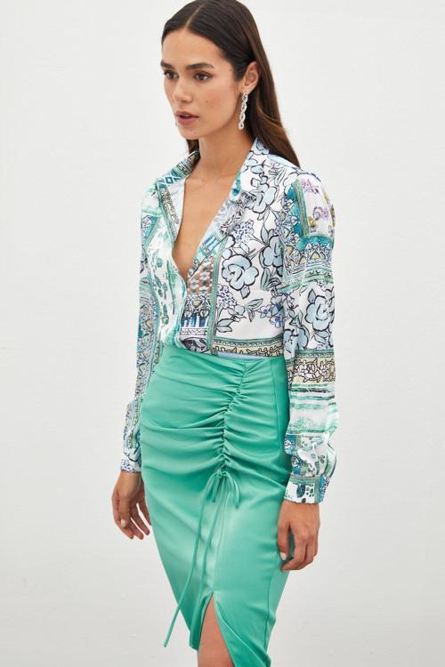Ön düğmeli kapama, düğmeli uzun kol, kalça altı boy, klasik desenli gömlek.
