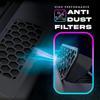 - RAHAT KONTROLLER + ZARIF RGB AYDINLATMA: Soğutucunuzu daha iyi kontrol etmek için öndeki üç düğmeyi kullanın. Soğutucuyu başlatmak için sadece ON tuşuna basın ve SPEED tuşuna basarak tercih ettiğiniz fan hızını seçin. Mevcut 3 renk arasından seçim yaparak ön ve yan ışıkları özelleştirmek için LED düğmesini kullanın. Daha nötr bir görünüm tercih ediyorsanız, bunları tamamen devre dışı bırakmak için aynı düğmeyi basılı tutabilirsiniz. Rahat bağlantı ve genişletilmiş işlevsellik için YERLEŞİK EKSTRA USB BAĞLANTI NOKTASI.
