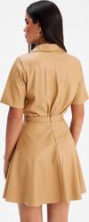 Yüksek bel, arka fermuarlı kapama, şardonlu, suni deri, kloş mini etek.
