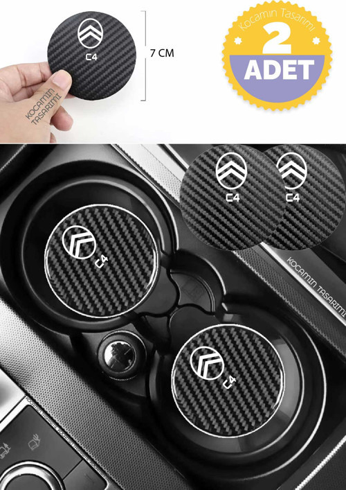 Kocamın Tasarımı Citroen C4 Siyah Karbon Bardak Altlığı 2 Adet Citroen Logolu C4 Yazılı 7 cm İçin Özel Tasarım