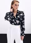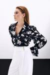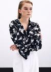 Ön yarım düğmeli, volanlı uzun kol, kalça altı boy, incili ve desenli salaş gömlek.