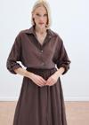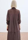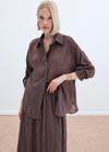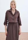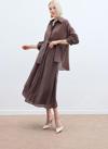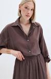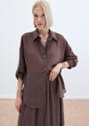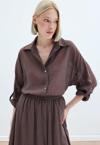 Ön düğmeli kapama, düşük omuz, katlanabilir kol, kalça altı boy, keten salaş gömlek.