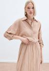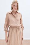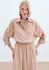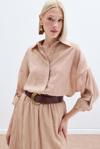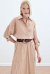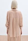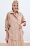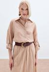 Ön düğmeli kapama, düşük omuz, katlanabilir kol, kalça altı boy, keten salaş gömlek.