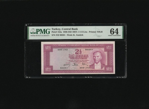 Koleksiyon 2.5 TL 2 1/2 İKİ BUÇUK Türk Lirası PMG 64 CHOİCE UNC ÇİL P 152a 1957 S/N Z42 80261 / 5.. Emisyon