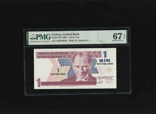 Koleksiyon Bir Yeni Türk Lirası 1 YTL P216 2005 PMG 67 EPQ SUPERB GEM UNC S/N A29619828 / 8.EMS 1. Tertip