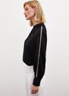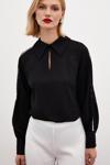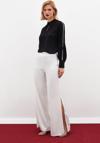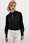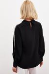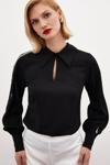Gömlek yaka, kalça altı boy, arka yaka düğmeli kapama, manşetli incili balon kol bluz.