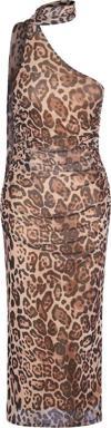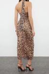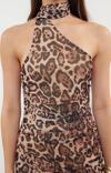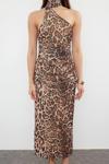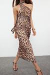 Ersefa Kolsuz Asimetrik Yaka Leopar Desenli Boyundan Bağlamalı Vücuda Oturan Tül Örme Midi Kalem Elbise