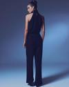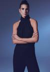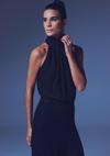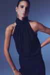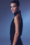 Büzgü detaylı yaka, esnek, kalça boy, arka yaka düğmeli, kolsuz parlak bluz.