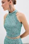 Dik yaka, iç astarlı, arka yaka düğmeli kapama, yan fermuarlı, kolsuz payetli bluz.