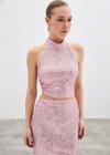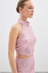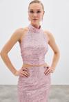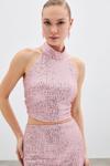Dik yaka, iç astarlı, arka yaka düğmeli kapama, yan fermuarlı, kolsuz payetli bluz.