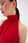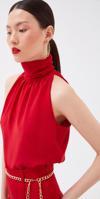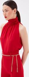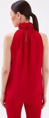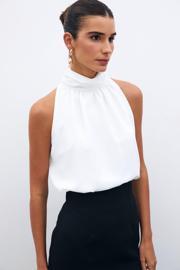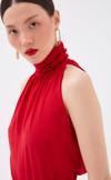 Büzgülü yaka, kolsuz, astarlı, kalça boy, şifon salaş bluz.