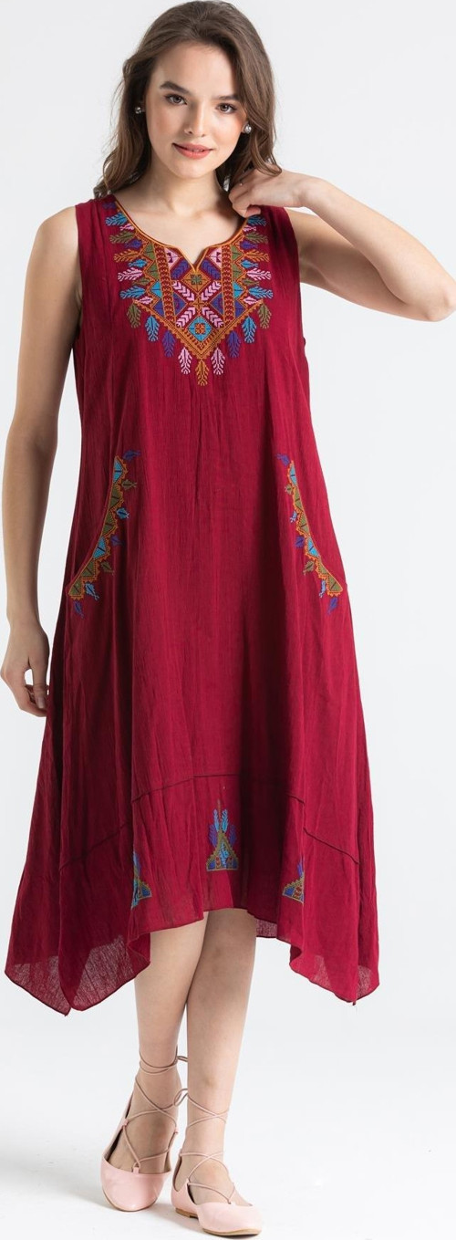 Eliş Şile Bezi Kolsuz Şile Bezi Antik Nakışlı Midi Boy Yazlık Elbise Bordo Brd