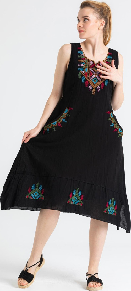 Eliş Şile Bezi Kolsuz Şile Bezi Antik Nakışlı Midi Boy Yazlık Elbise Siyah Syh