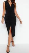 Moda Kolsuz Kollu V Yaka Maxi Elbise Koyu Kahverengi Fitted Vücuda Oturan Büzgü Detaylı Midi Esnek Örme Kalem Elbise