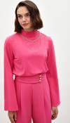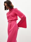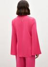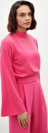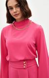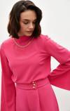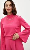 Dik yaka, uzun ispanyol kol, kalça altı boy, arka yaka düğmeli, salaş, çıkarılabilir aksesuarlı bluz.