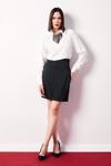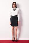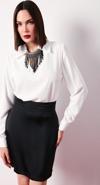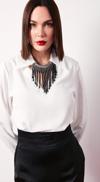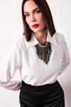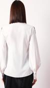 Gömlek yaka, manşetli uzun kol, arka yaka çift düğmeli kapama, kalça boy, birleşik kolyeli salaş bluz.