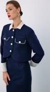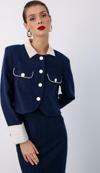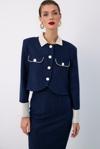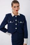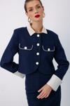 Bisiklet yaka, uzun katlı kol, düğmeli süs cep, vatkalı, ön düğmeli kapama, iç astarlı, kontrast kısa tüvit ceket.