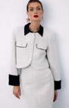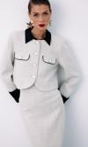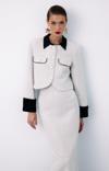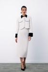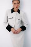 Bisiklet yaka, uzun katlı kol, düğmeli süs cep, vatkalı, ön düğmeli kapama, iç astarlı, kontrast kısa tüvit ceket.
