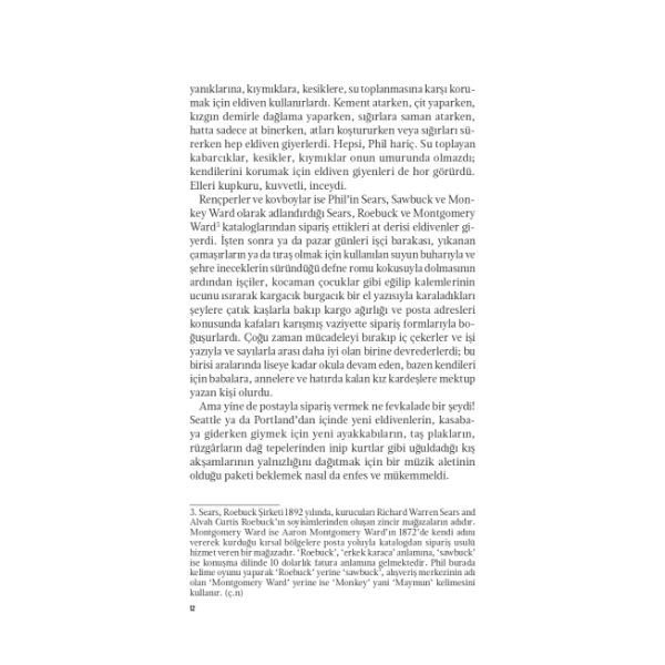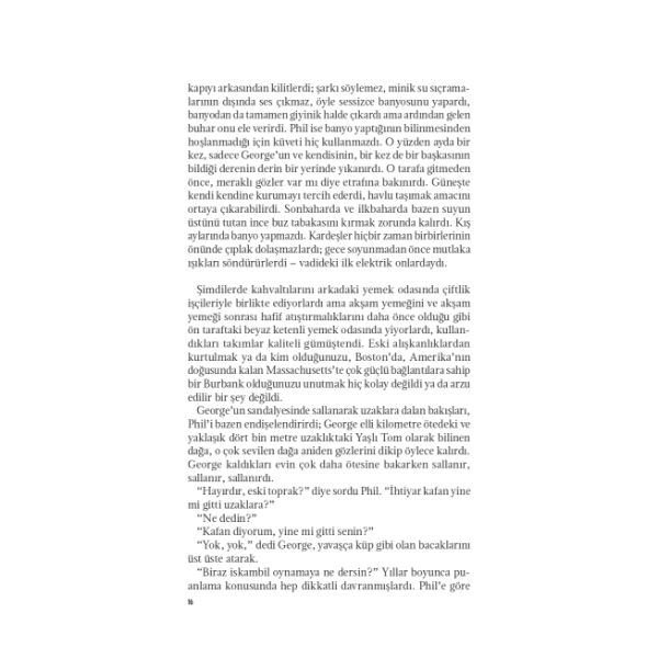 1920’lerin Montana’sında geçen bu sürükleyici aile dramı, vadideki en büyük çiftliğin sahibi iki erkek kardeşin hikâyesini anlatıyor. Çiftliğe gelmeleriyle birlikte –zaten olmayan– huzuru bozan bir kadın ve bir delikanlının, bir anne ve oğlunun sarsıcı hikâyesi... Roman, Thomas Savage’ın ilk kelimesinden son kelimesine kadar okuru esir alan sesi, karakterlerin tutkusu ve zalimliğiyle sarmalanıyor.