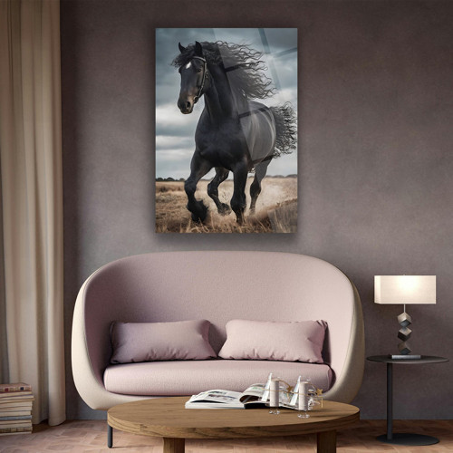 Güçlü duruşu ve hareket hissiyle öne çıkan bu özel koşan siyah at temalı cam tablo, modern dekorasyona etkileyici ve asil bir dokunuş kazandırır.