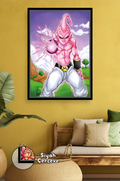 Bu çerçeveli kanvas tablo, Dragon Ball Z anime serisinin en ikonik kötü karakterlerinden Majin Buu’yu güçlü bir saldırı anında tasvir eder.