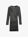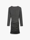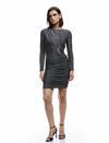 Mini boy tasarımı ve drape detaylarıyla dikkat çeken elbise, özel davetler ve partiler için mükemmel bir seçim sunuyor. Uzun kollu ve dar kesimi sayesinde vücuda zarif bir şekilde uyum sağlıyor. Bisiklet yaka tasarımıyla sade ama şık bir görünüm sergileyen bu elbise, simli kumaşıyla da ışıklar altında parlayarak tüm dikkatleri üzerinde topluyor. Hem günlük hem de özel günlerde zarif bir şıklık sunuyor.