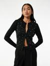 Taş detaylı uzun kollu bisiklet yaka triko hırka, zarif tasarımıyla göz dolduruyor. Taş detayları ve düğmeli tasarımı modern bir şıklık sunarken, rahat kesimiyle konfor sağlıyor. Hırkanın triko yapısı günlük kullanımdan özel davetlere kadar geniş bir kullanım alanı sunuyor. Hırka, her türlü kombinle uyum sağlayarak gardırobunuzda mutlaka yer alması gereken bir parça haline geliyor.