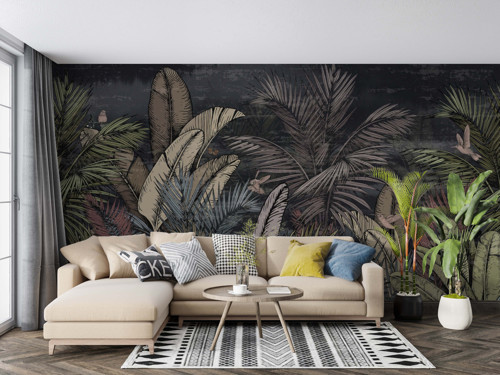 Grown Koyu Temalı Renklerde Tropikal Yapraklar Desenli Duvar Kağıdı, Doğa Manzarası - Oturma Odası ve Yatak Odası